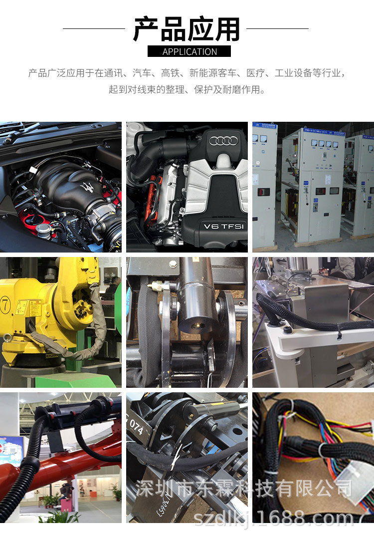 產品廣泛應用在通訊、汽車、高鐵、新能源客車、醫療。工業設備等行業,起到對線束的整理、保護及耐磨作用。